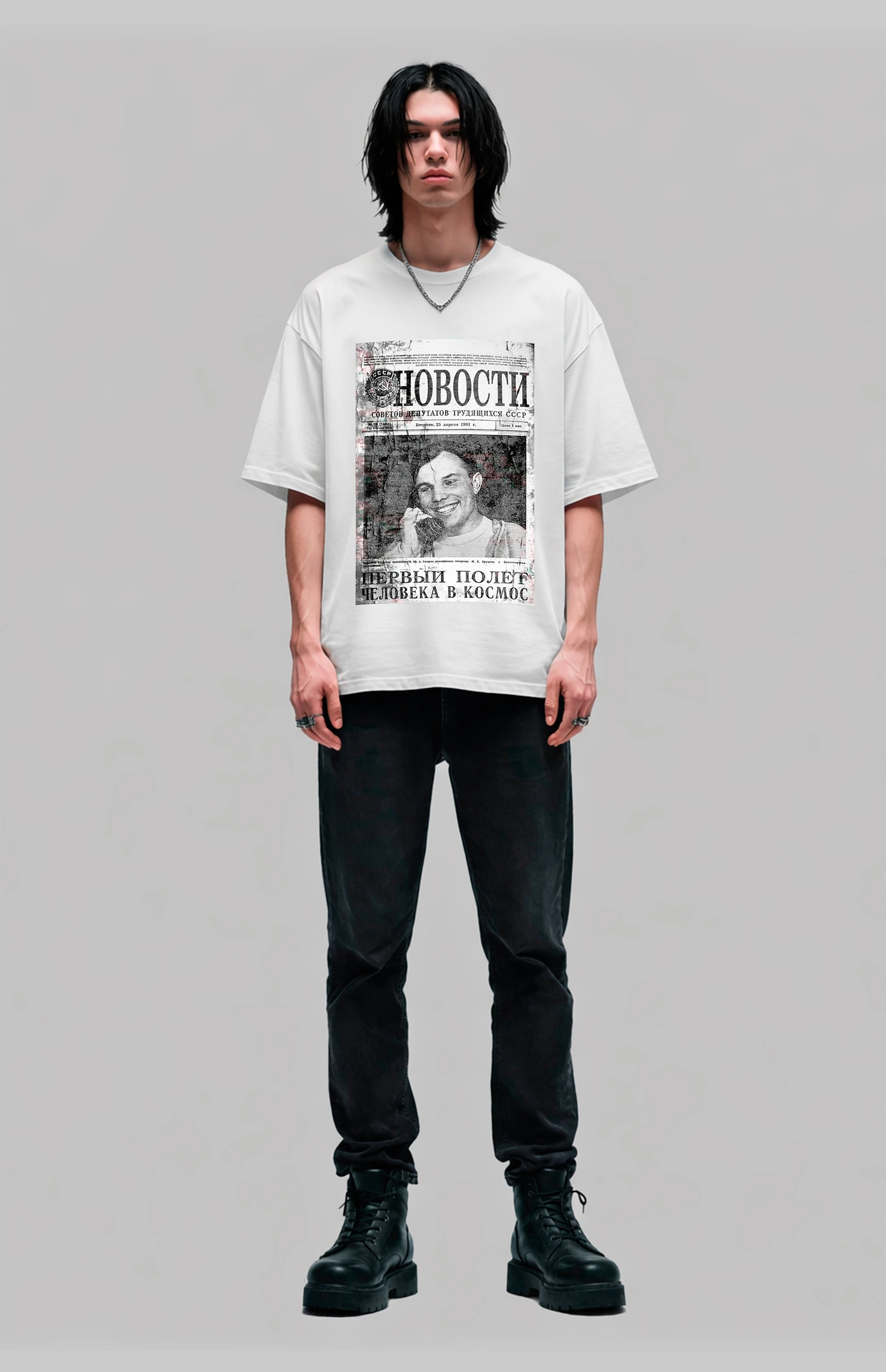 Футболка ГАГАРИН — это первая полоса, которую видел весь мир. 12 апреля 1961 года советские газеты вышли с одним заголовком: «Первый полёт человека в космос». Этот принт — точная копия той страницы. Гагарин смотрит с груди, будто новость только что случилась.